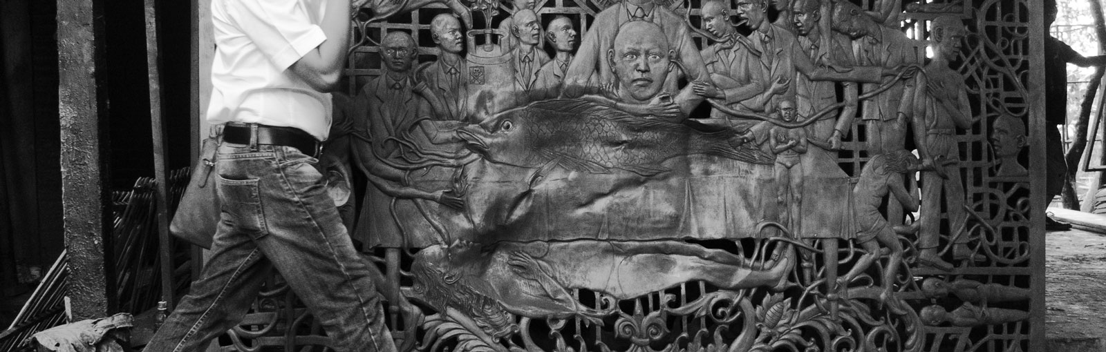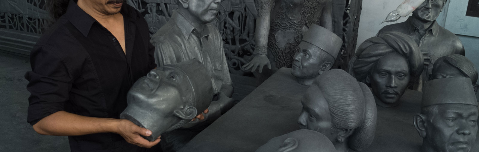 Entang Wiharso (b. 1967) majored in Painting and obtained his BA in the Art at the Indonesian Art Institute in Yogyakarta. A painter and sculptor, his hyper realistic imagery gives the impression of surrealism, as he juxtaposes the past with the contemporary, the imaginative and the real. Entang uses bronze, graphite and aluminium mixed with other materials for his sculptures and installations, interspersed with large paintings. He is inspired by personal and public memory and experiences, Javanese myths and legends, the Candi reliefs, and by popular iconography in which political, social and historical facts and situations are interwoven.