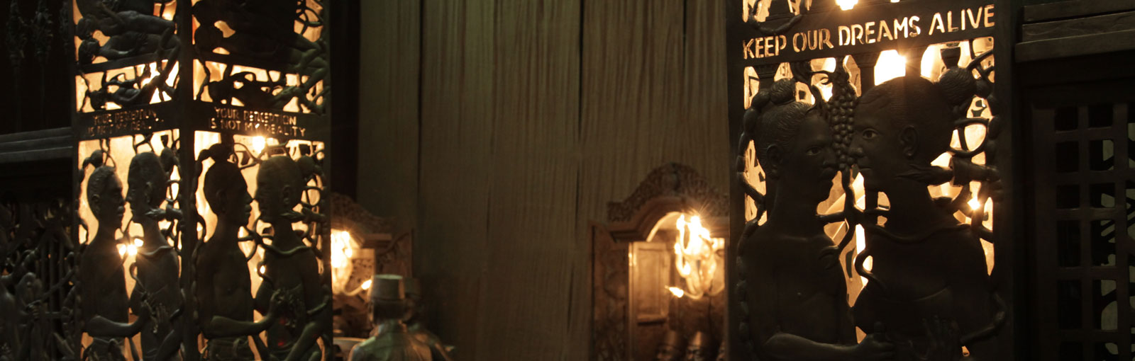 His installation for the pavilion, The Indonesian: No Time to Hide, features a large gate covered with reliefs referencing the Borobodur Temple, but depicting contemporary life. “Keep our dreams alive” and “Your perception is not my reality” are the two sentences appearing on the entrance gates. The sculptures around a meeting table outside the fortress have distorted faces of the country’s past and present presidents, which refer to perception versus reality, and to how negative notions of the country are countered by the inner strength of its citizens who stand tall, a feat of Sakti.