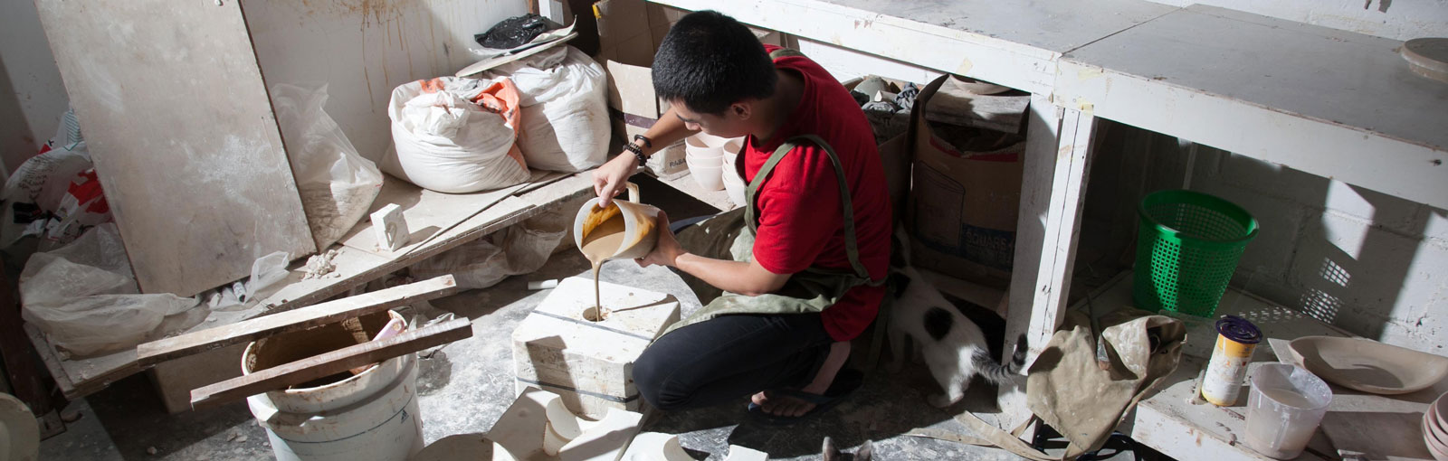 Albert Yonathan (b. 1983) received his Bachelor of Fine Arts from the Ceramic Studio at the Faculty of Art and Design, Bandung Institute of Technology (ITB) in 2007, and an MA in Visual Arts also at ITB in 2012. The artist uses ceramics as a high conceptual and performative art. His works explore the spiritual dynamics between humans and the natural world, combining hundreds of manually moulded ceramics arranged into patterned configurations. Following geometric formations imbued with an ancient symbolic meaning, they bring a sense of the meditative and the spiritual. Recurrent themes are birds and humans arranged repetitively, while labyrinths appear in circular or rectangular shapes.
