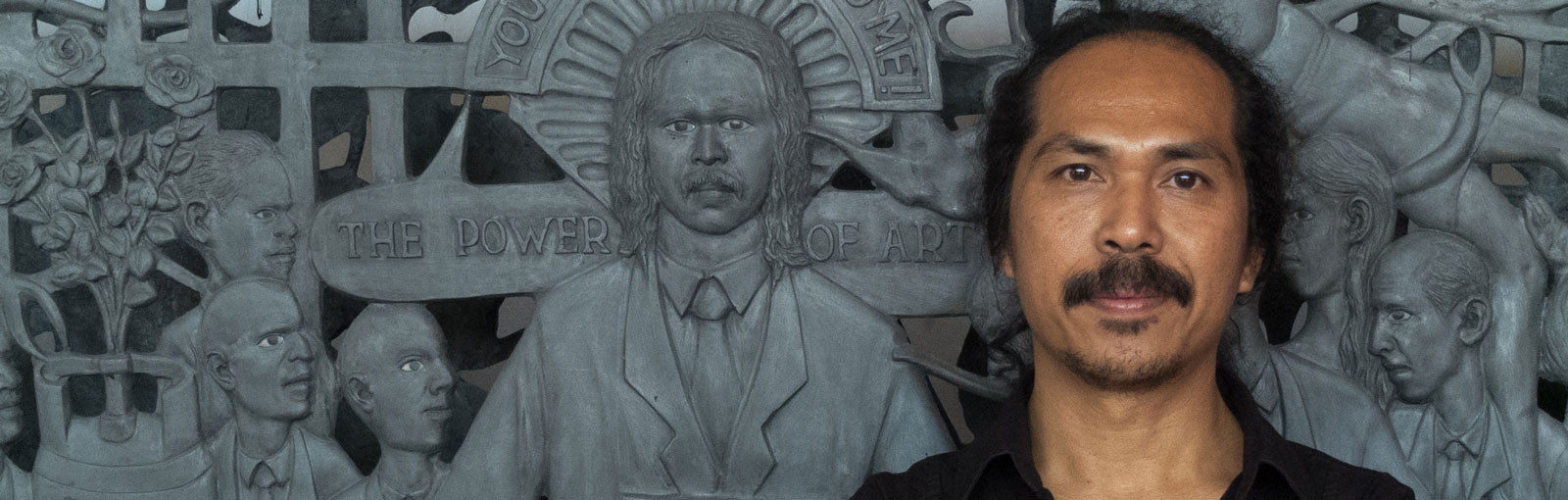 Entang Wiharso (b. 1967) majored in Painting and obtained his BA in the Art at the Indonesian Art Institute in Yogyakarta. A painter and sculptor, his hyper realistic imagery gives the impression of surrealism, as he juxtaposes the past with the contemporary, the imaginative and the real. Entang uses bronze, graphite and aluminium mixed with other materials for his sculptures and installations, interspersed with large paintings. He is inspired by personal and public memory and experiences, Javanese myths and legends, the Candi reliefs, and by popular iconography in which political, social and historical facts and situations are interwoven.
